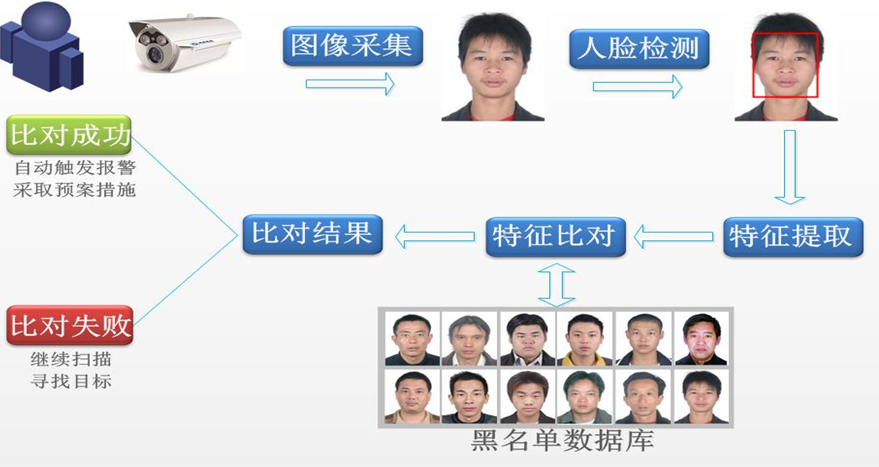 针对社区重点区域部署动态人脸识别系统,实时监控社区内人员,一旦识别到黑名单人员进行声光报警并上传黑名单信息到管理平台。